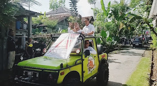 Didampingi suaminya Bangkit, dengan menggunakan mobil Jeep, Dian Eka Winartiningsih yang mengenakan baju putih dibalut sebuah selendang warna hijau itu, disepanjang selalu melambaikan salam tiga jari, kepada masyarakat yang dijumpai disepanjang jalan.